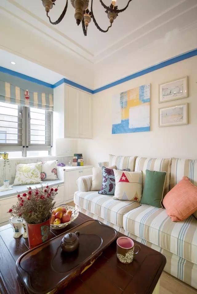 客廳吊頂做了簡單的石膏線,藍色的裝飾帶使空間顯得十分靈動。
