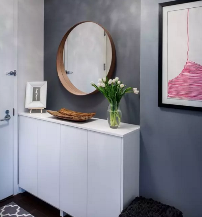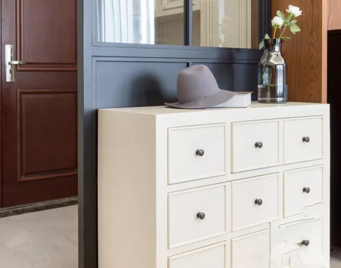 這樣中間和柜底懸空的設(shè)計,中間放綠植、相框、鑰匙、零錢的,底部放常穿的鞋子,其他封閉起來的柜子都可以當做收納柜。