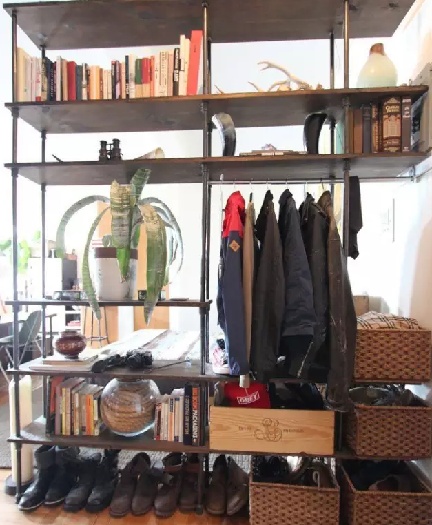 小戶型、一居室,床和門口離得近,不如在玄關(guān)處安裝一個大型置物架,不僅收納出門衣物,還能履行房間里的其他收納任務(wù)。只要你不擺的太滿,就不會影響采光。