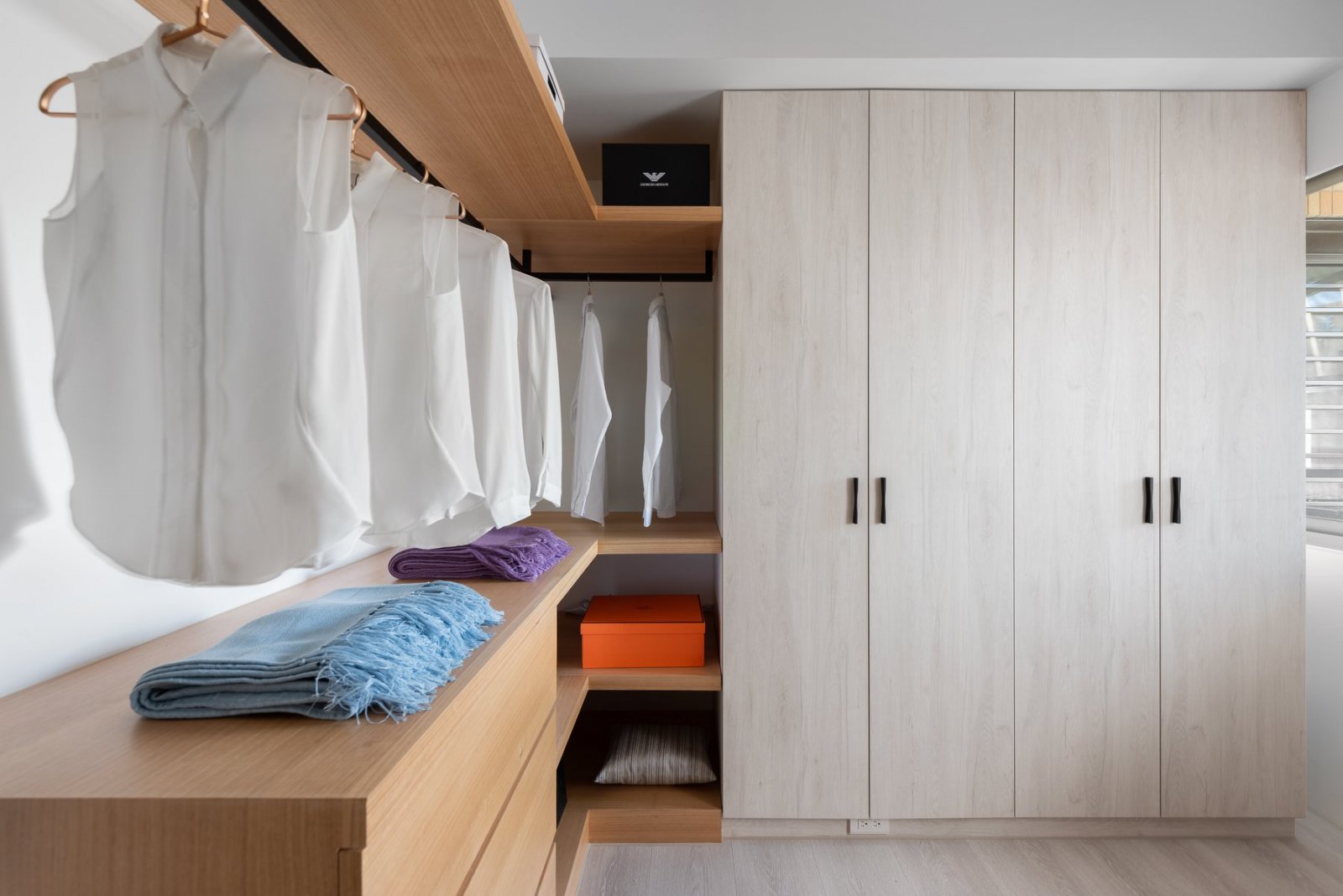 空間利用與使用比率一般有兩種,一種是建筑本身分割出來的,一種是通過自己或設(shè)計(jì)師,重新分割空間劃分出來的,實(shí)際上后者在空間上并不需要大,夠用就行。不常穿的衣物,不要占用空間,這是流動(dòng)空間的優(yōu)化體現(xiàn)。