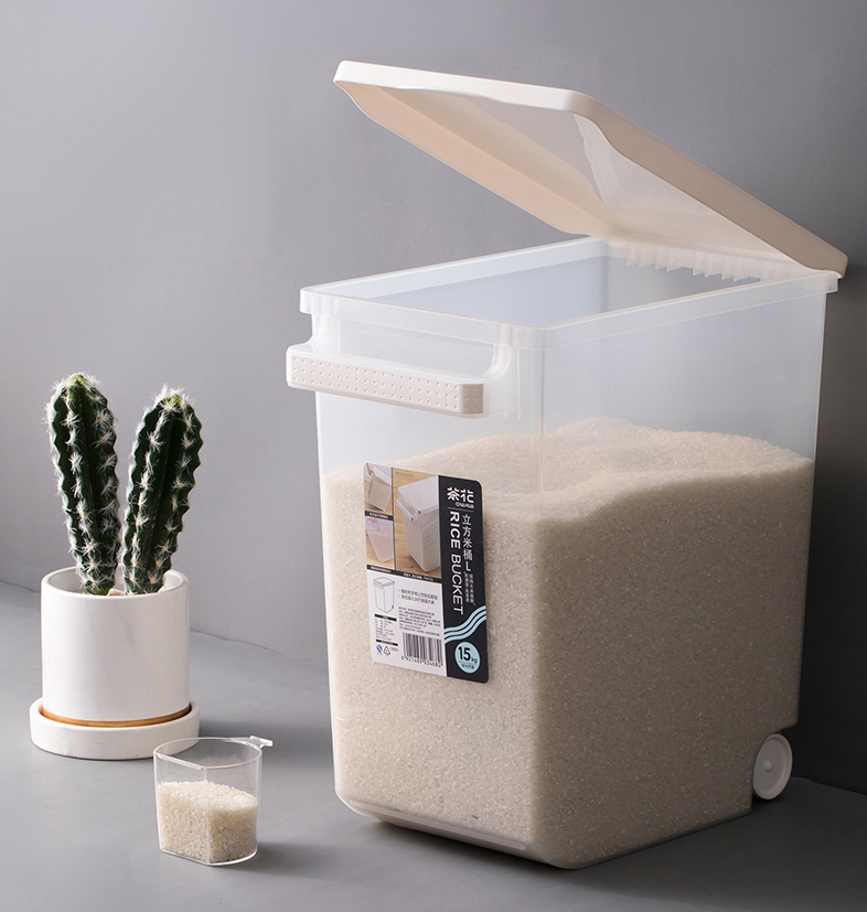 密封膠圈設(shè)計,利于密封保存,而且塑料米桶防塵又防潮,容量大,能儲藏30斤大米。設(shè)手柄和腳輪,搬運方便,底部是弧形的拐角,利于刮取剩下的少量米。
