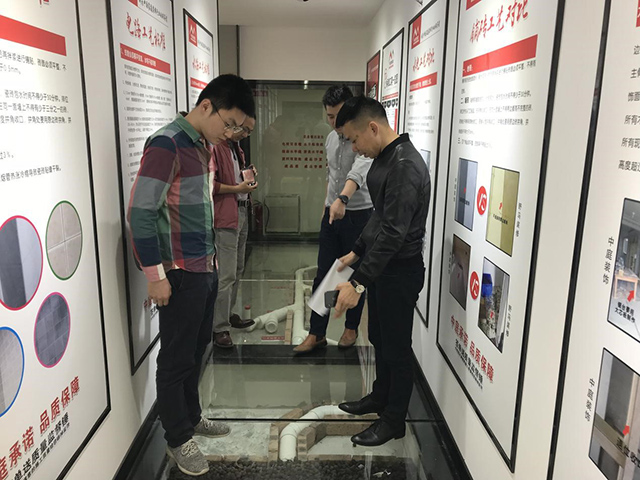 △【中航聯(lián)控股集團(tuán)副總裁金洪路先生(右)向南寧慈銘代表團(tuán)詳細(xì)介紹衛(wèi)生間施工工藝解剖】