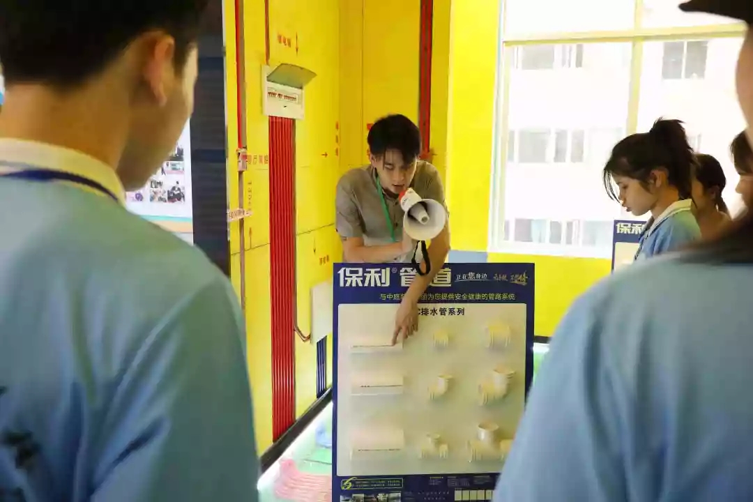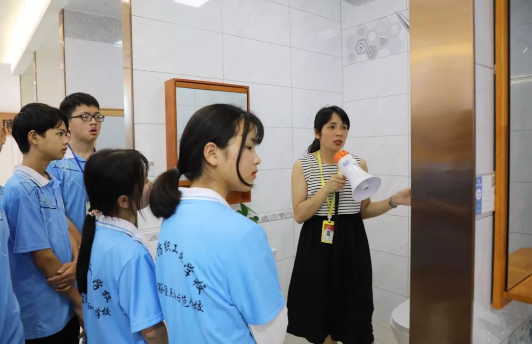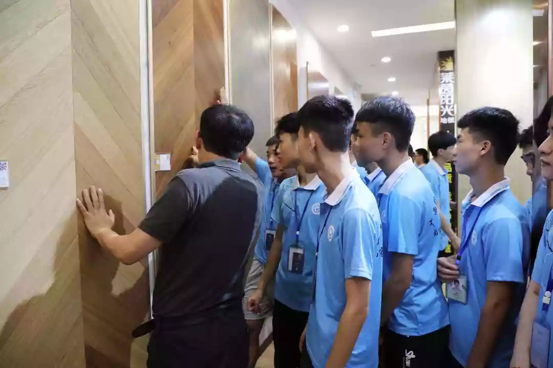 運營部設(shè)計經(jīng)理韋昌豪帶領(lǐng)學生參觀軟裝體驗館、工藝樣板間,講解裝修設(shè)計、裝修工藝、水電工程用料方面的知識,并解答學生們的疑問。