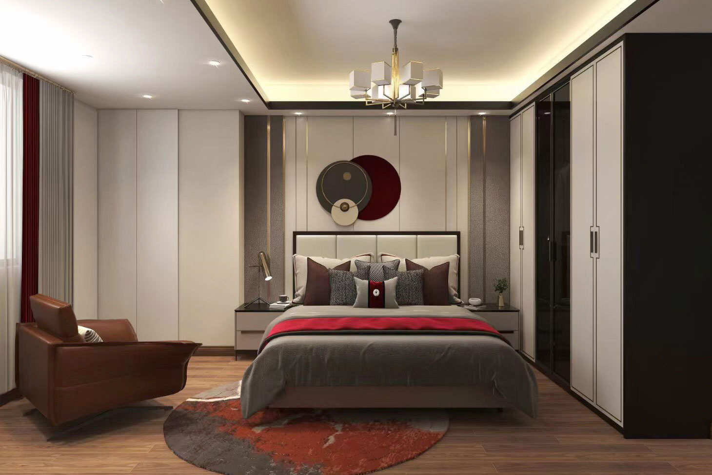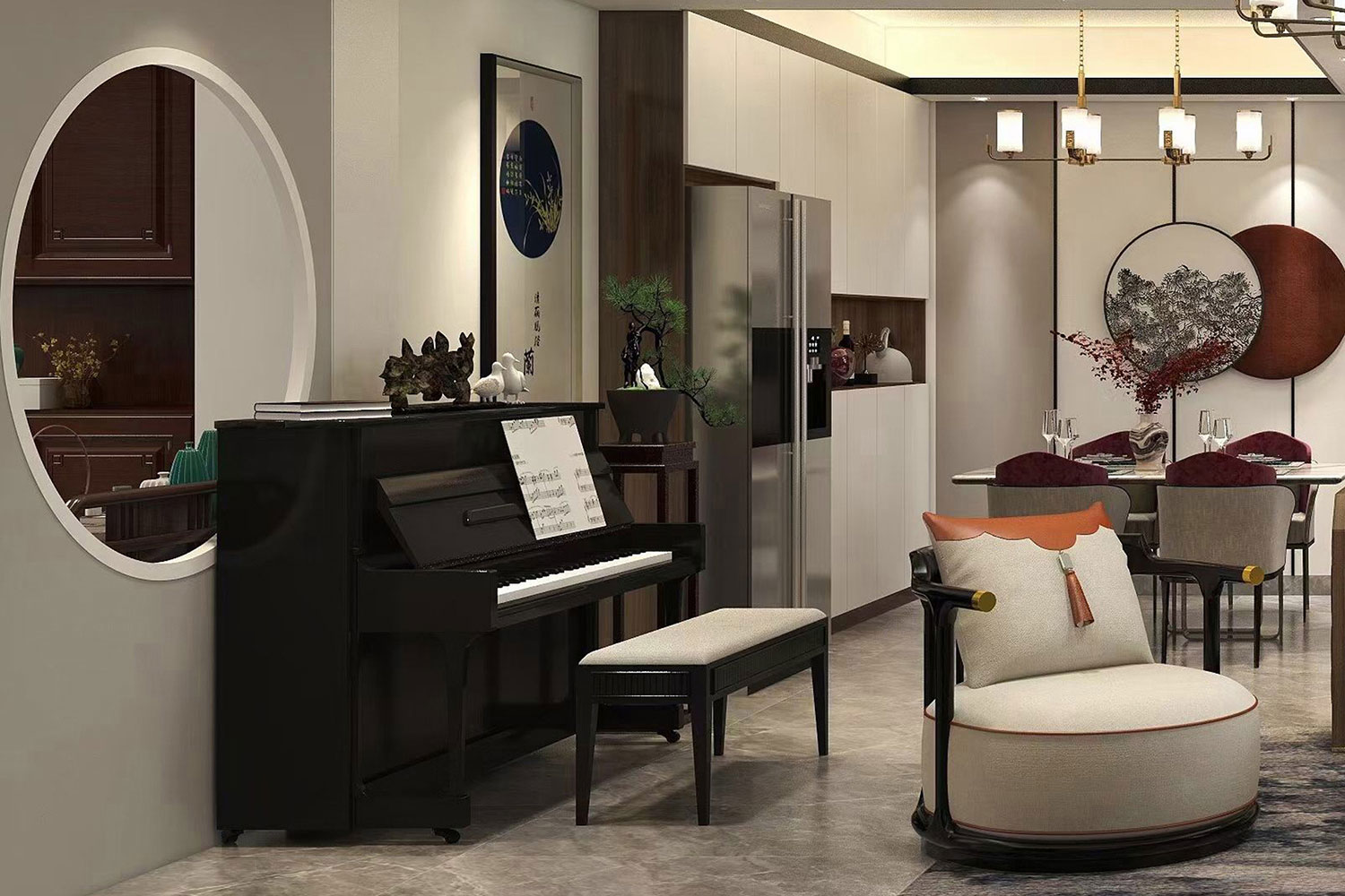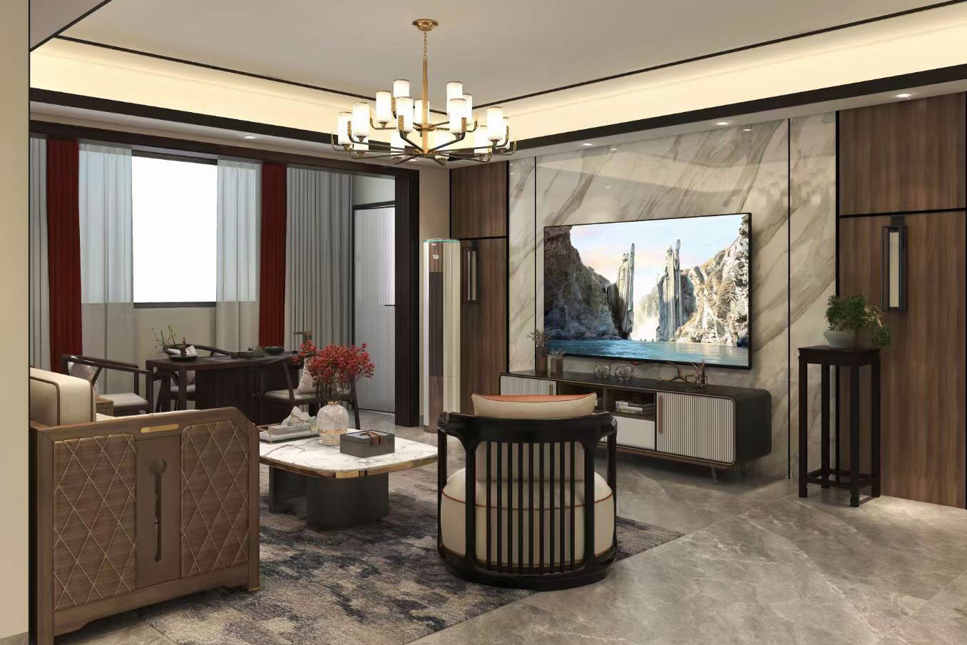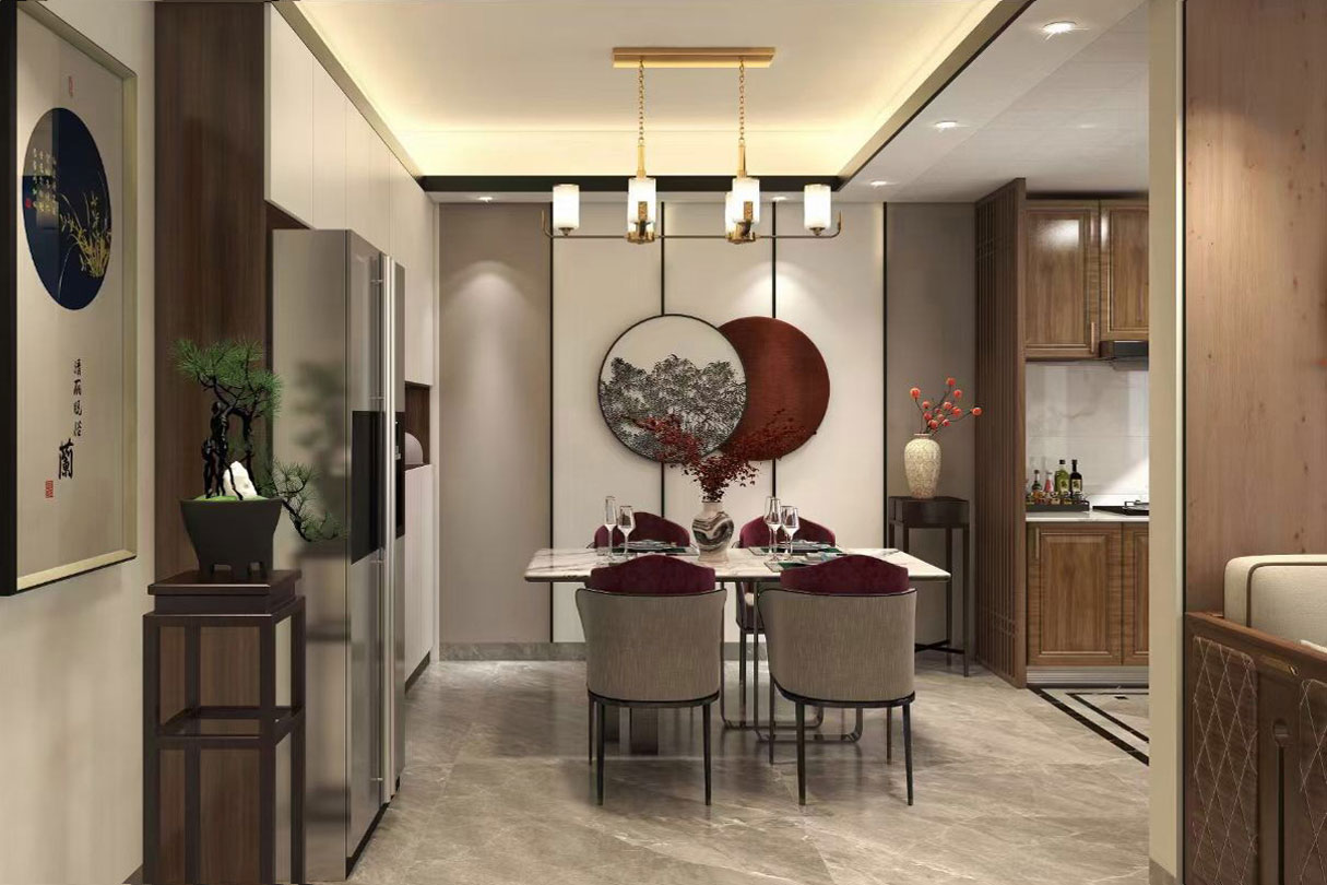 天立TT國際258㎡案例,戶型為:四房兩廳兩衛(wèi),屬于新中式風(fēng)格。整體家具陳設(shè)講究對稱,重視文化意蘊(yùn),整體以深色為主,以古香古色的中式擺件、掛畫來點(diǎn)綴空間,在一些細(xì)節(jié)上勾勒出禪宗的意境。但同時會使用現(xiàn)代時尚元素,比如附帶金屬邊框的桌椅、花瓶,以及背景掛飾等,使整體的家居設(shè)計中既有中式家居的傳統(tǒng)韻味,又有現(xiàn)代家居的時尚大氣。