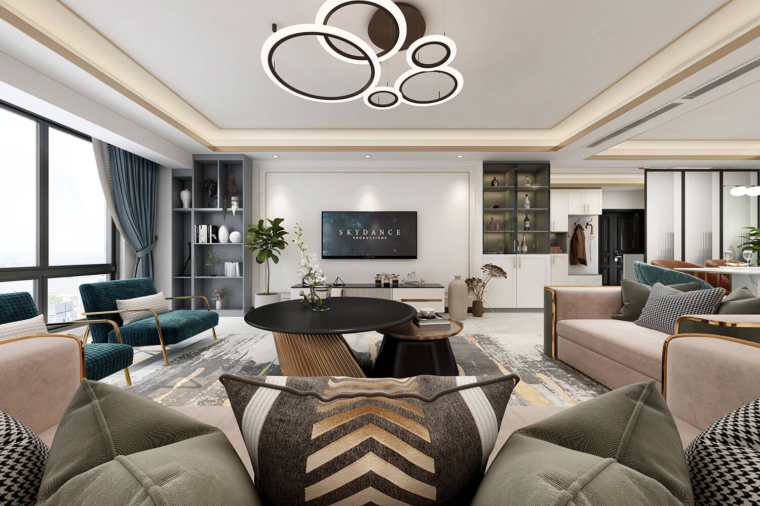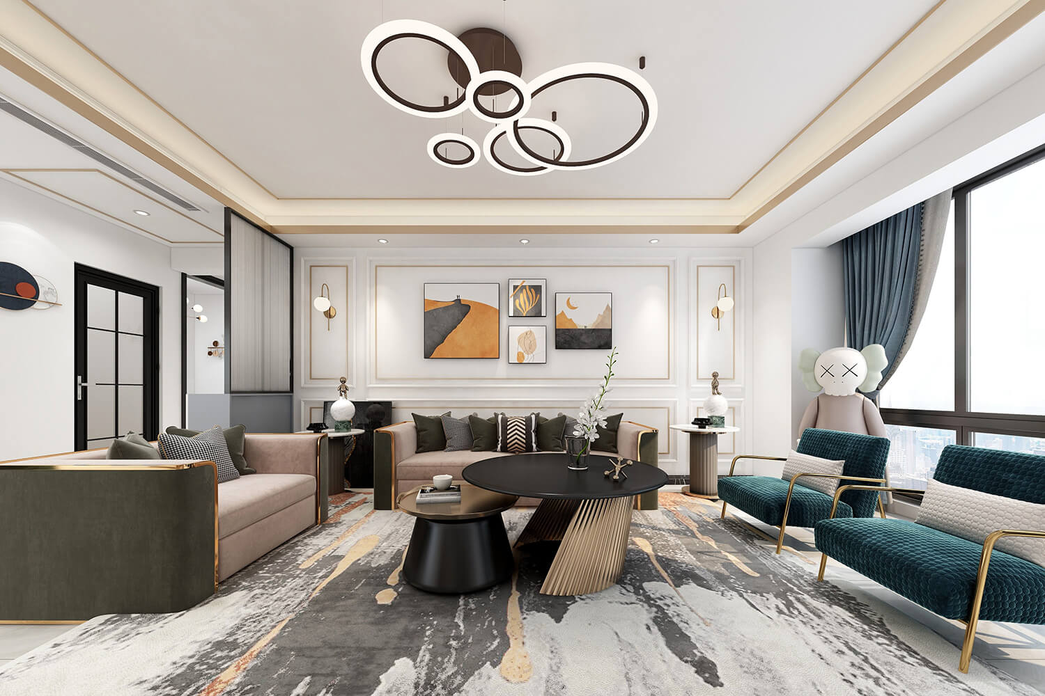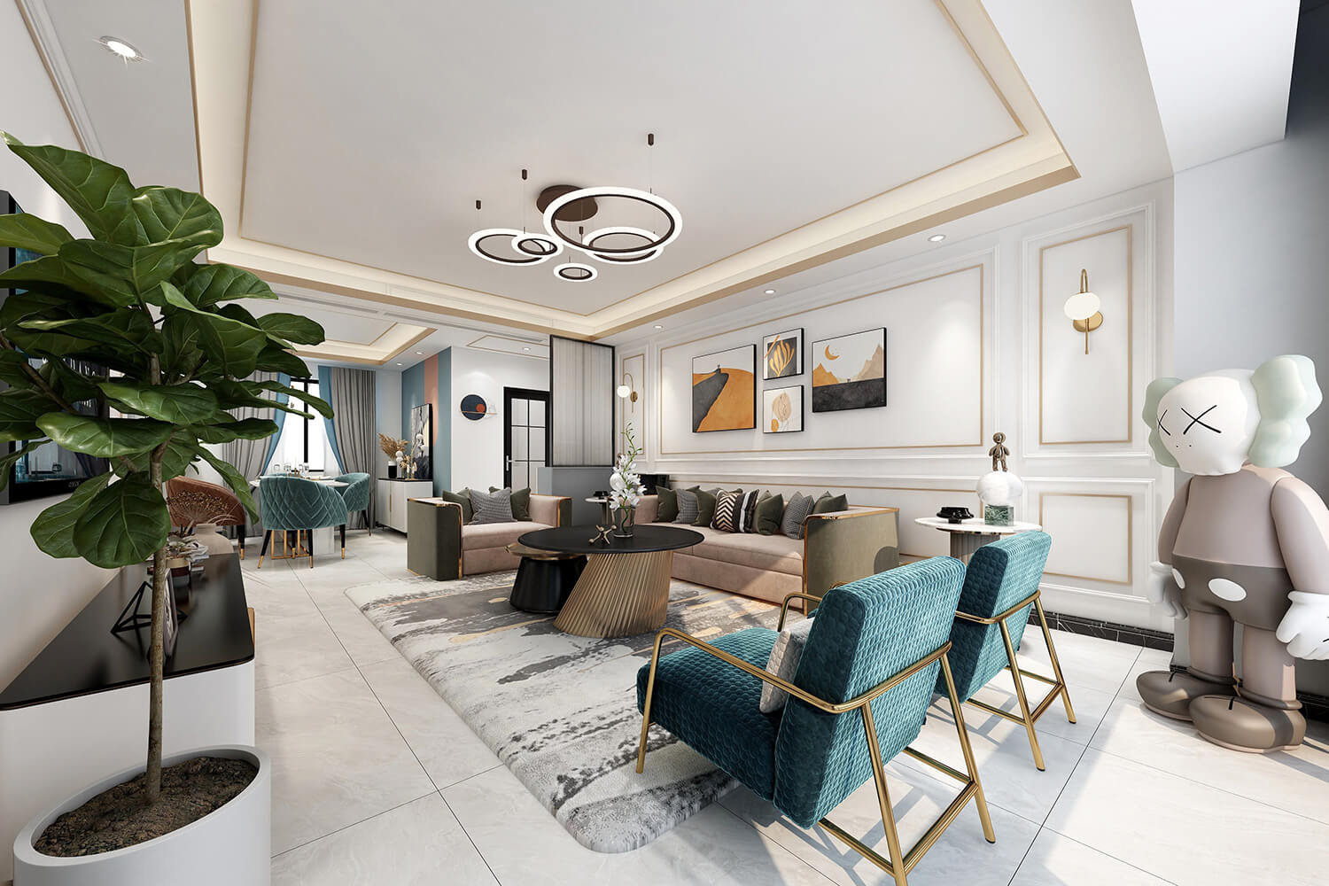 本案總面積118㎡,整體配色以白色為主色調(diào),用充滿清新氣息的綠與藍為空間帶來清爽感覺,點亮空間視覺色彩感知,展現(xiàn)別具一格的視覺感,華麗的金屬色澤增添輕奢質感。