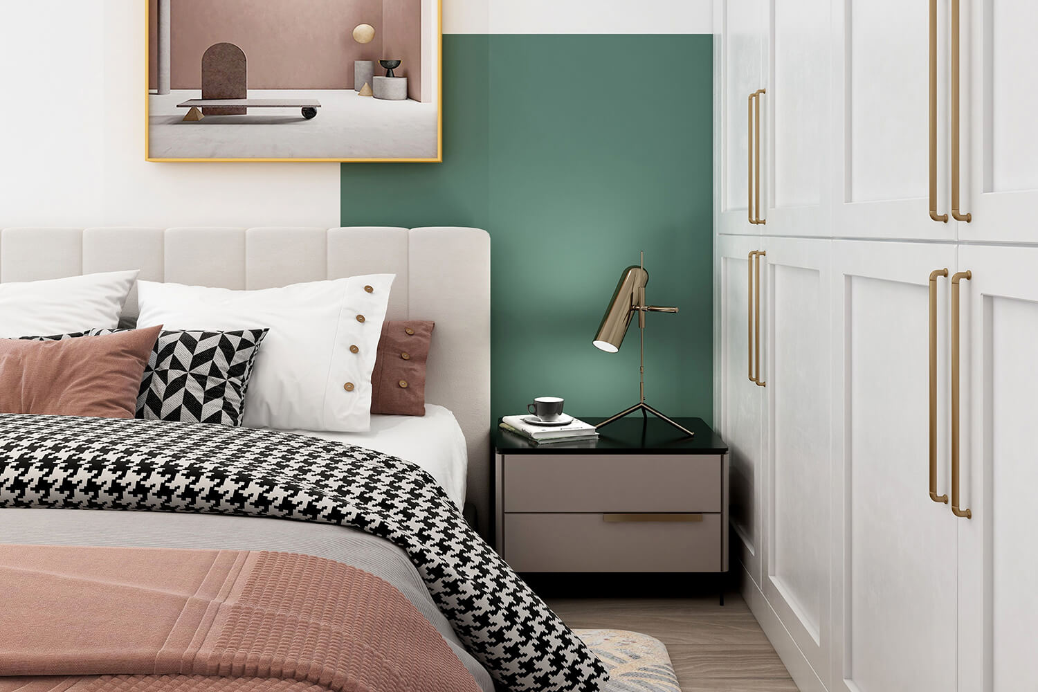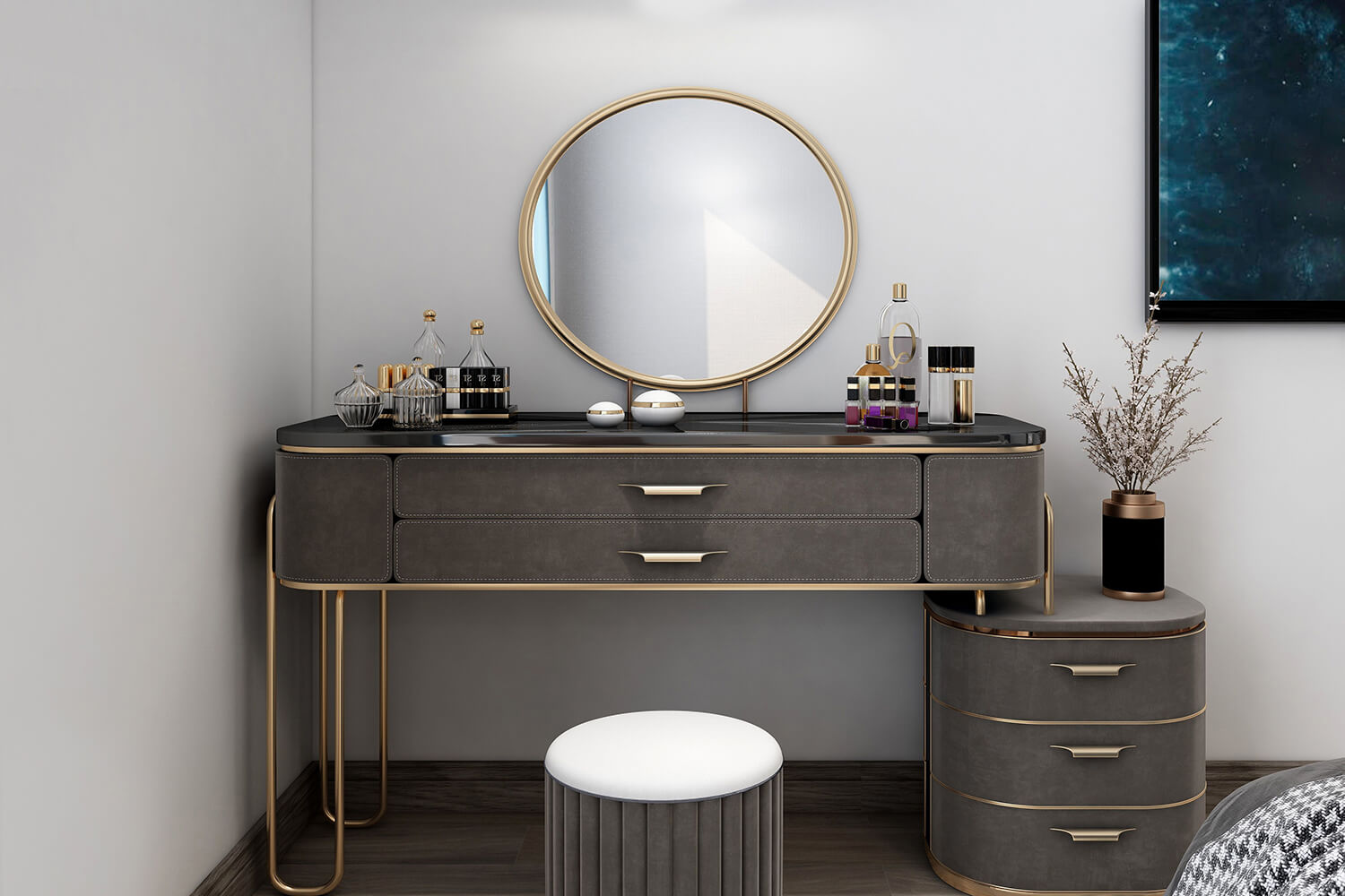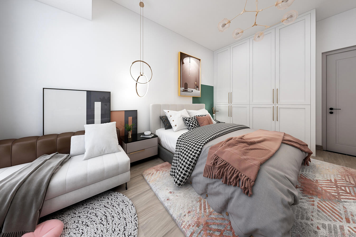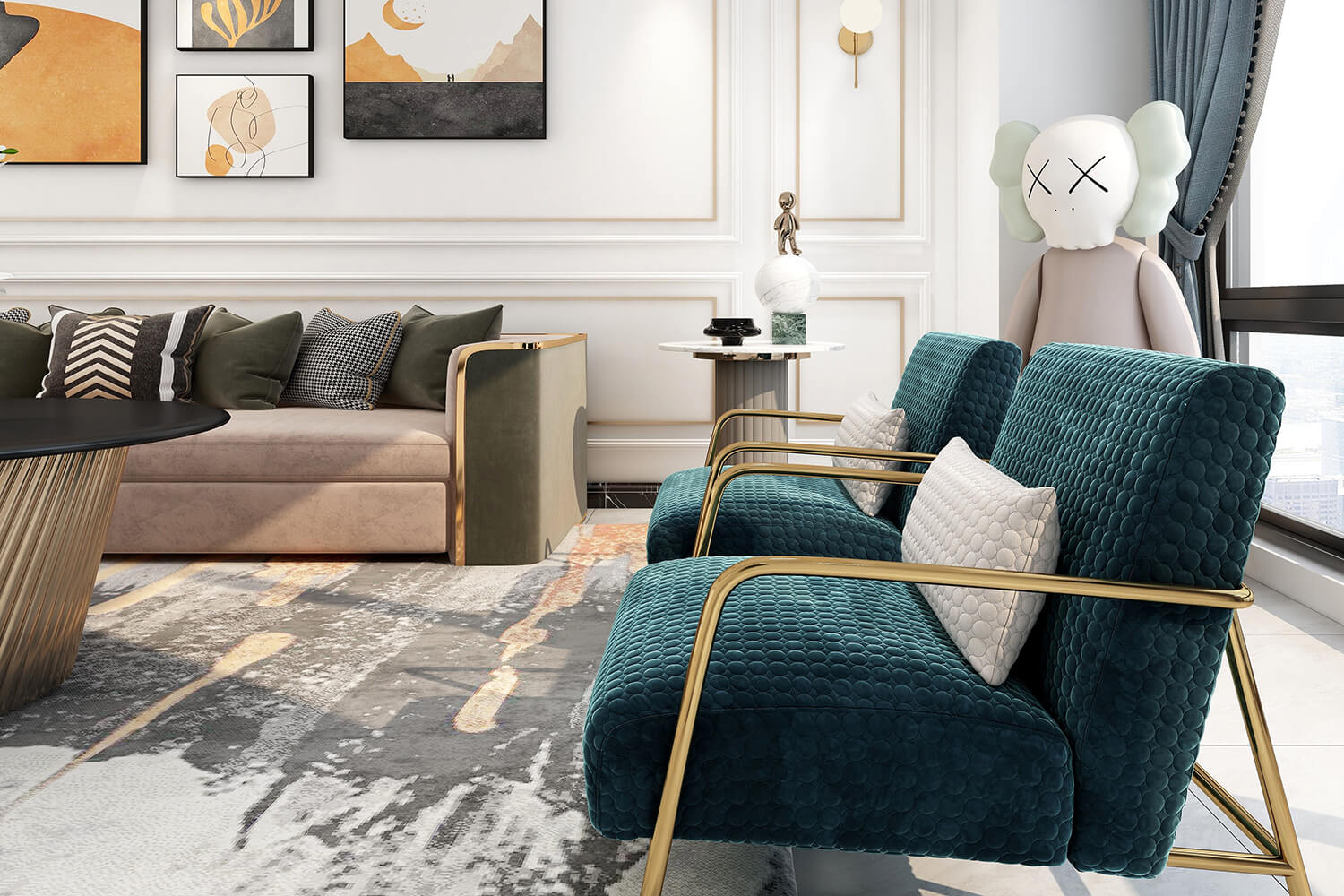 本案總面積118㎡,整體配色以白色為主色調(diào),用充滿清新氣息的綠與藍為空間帶來清爽感覺,點亮空間視覺色彩感知,展現(xiàn)別具一格的視覺感,華麗的金屬色澤增添輕奢質感。