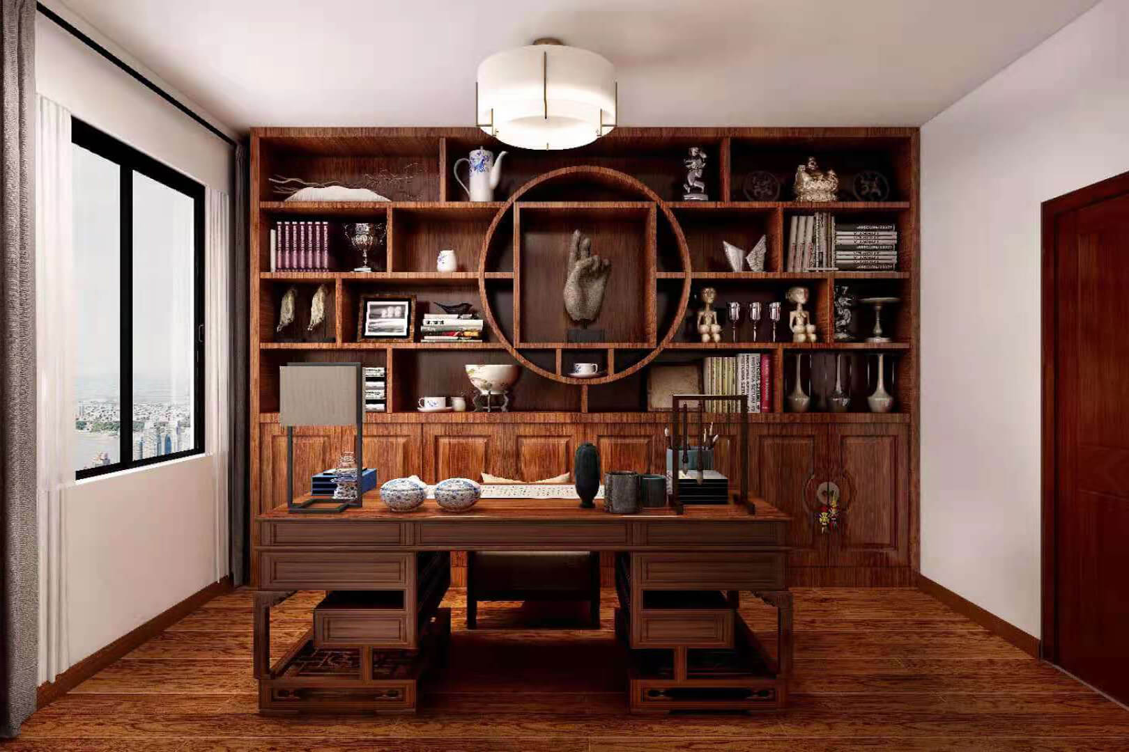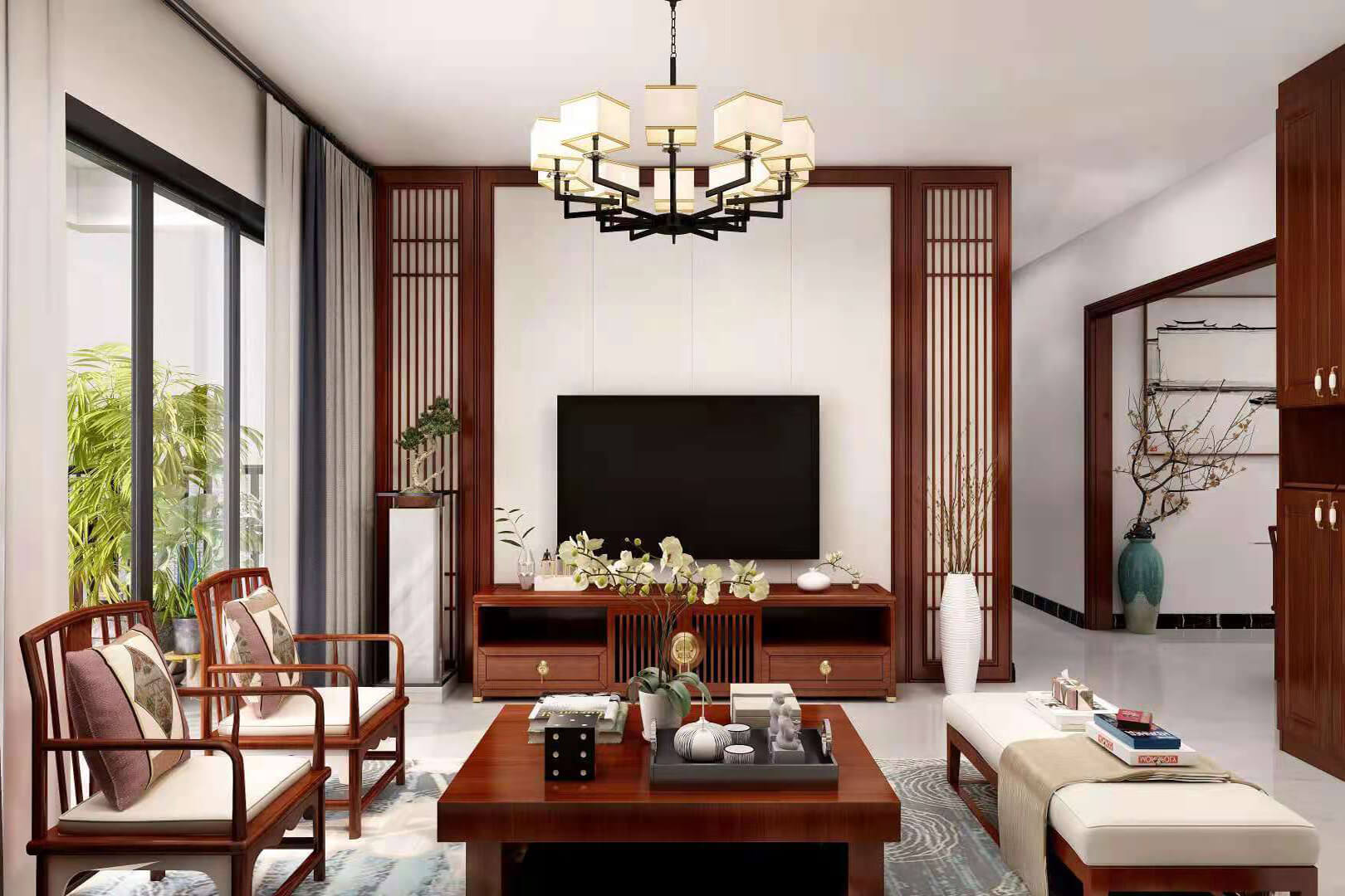 瀏覽量:552房子整體家具以紅木為主??蛷d采用白色地磚和留墻面與家具搭配讓顏色看起來(lái)更為簡(jiǎn)潔,不做裝飾的吊頂讓整體的空間看起來(lái)更寬大。房間采用紅木地板與房間家具色彩呼應(yīng),墻面留白用水墨畫裝飾讓房間裝飾更豐富,也讓色彩更多了層次感。
