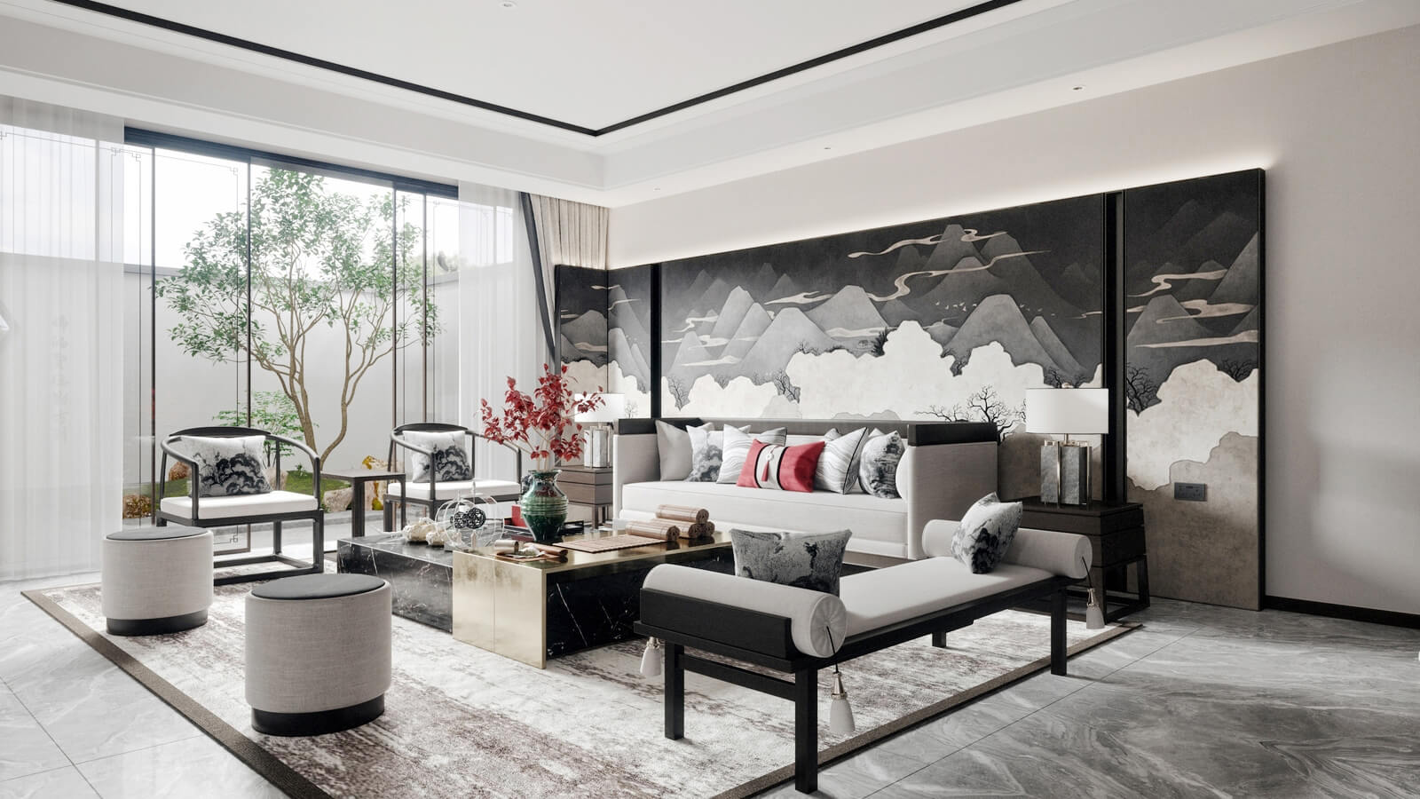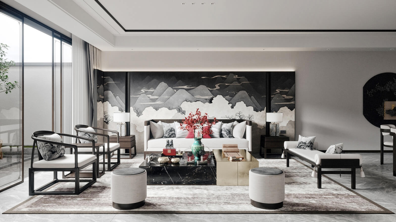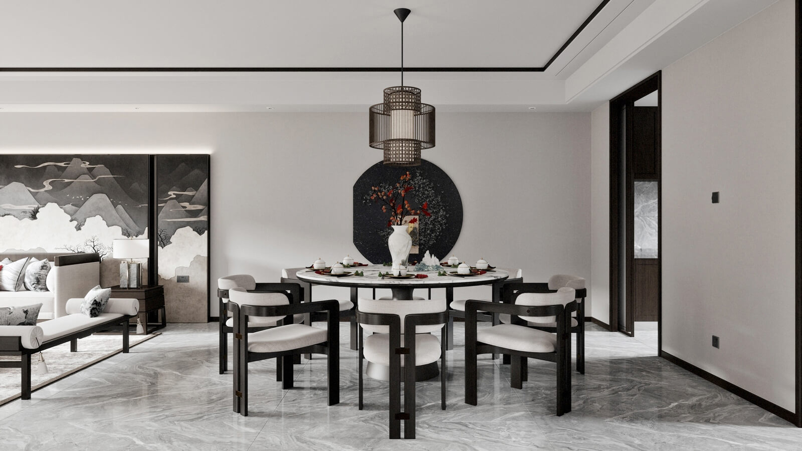 瀏覽量:1139設(shè)計師打破了人們對傳統(tǒng)中式風(fēng)格的固有觀念,加入了許多現(xiàn)代化的設(shè)計元素。其中,中國風(fēng)味一點(diǎn)兒也沒少。山水畫,瓷器,深色桌椅,這些富含古典韻味的裝飾,完美地與現(xiàn)代化的空間融為一體,體現(xiàn)出靜謐的美感。
