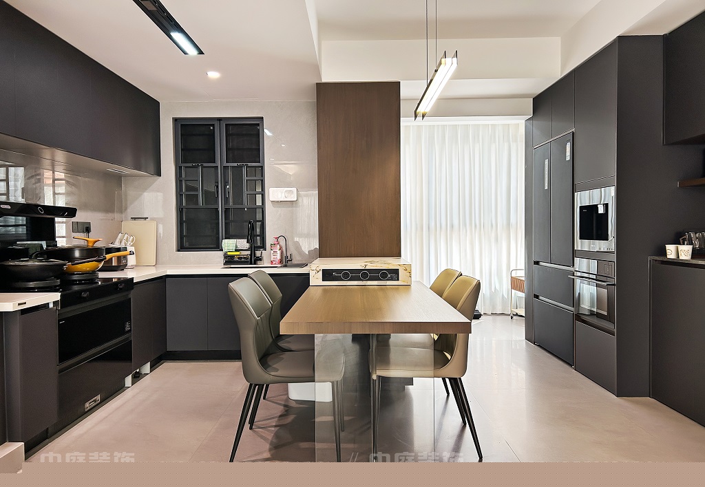 瀏覽量:72客廳以現(xiàn)代黑白灰極簡(jiǎn)風(fēng)格為核心,大面積白紗簾引入自然光線(xiàn),黑色皮質(zhì)沙發(fā)質(zhì)感高級(jí)。開(kāi)放式布局,深灰櫥柜與木質(zhì)餐桌形成材質(zhì)對(duì)比,線(xiàn)性吊燈提升精致感,功能與美學(xué)兼具,營(yíng)造現(xiàn)代簡(jiǎn)約的烹飪用餐氛圍。輕柔窗簾與柔和燈光,打造靜謐休息空間。精致的材質(zhì)選擇與合理的功能規(guī)劃,詮釋了“少即是多”的現(xiàn)代簡(jiǎn)約居住美學(xué)。