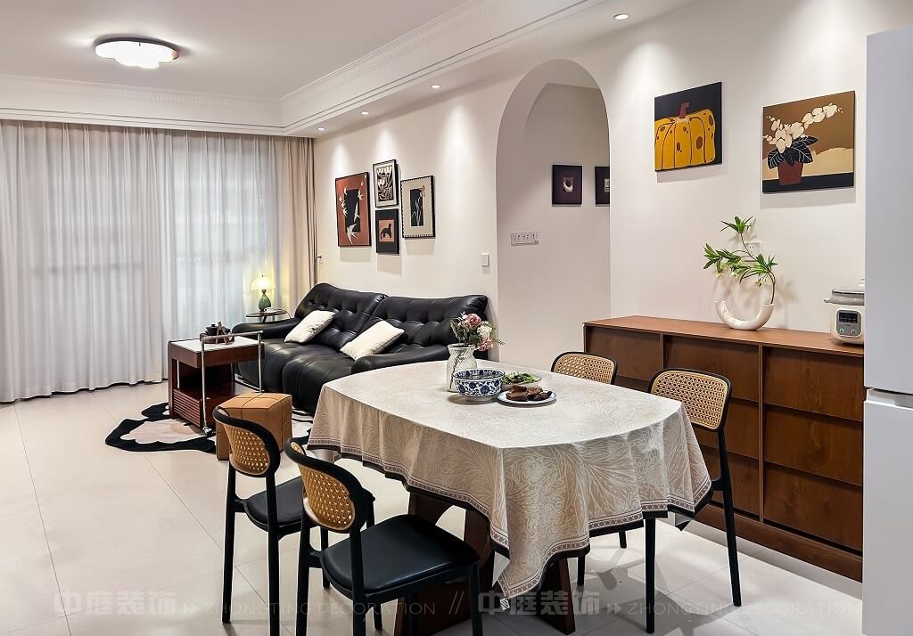 整體空間通過燈光設(shè)計、材質(zhì)搭配(皮質(zhì)、木質(zhì)、藤編等),營造出舒適且富有格調(diào)的居住氛圍,細節(jié)處的裝飾畫、綠植、中國結(jié)等元素,提升了空間的藝術(shù)感與生活氣息。復(fù)古與現(xiàn)代碰撞的家,每一處都戳中審美點!