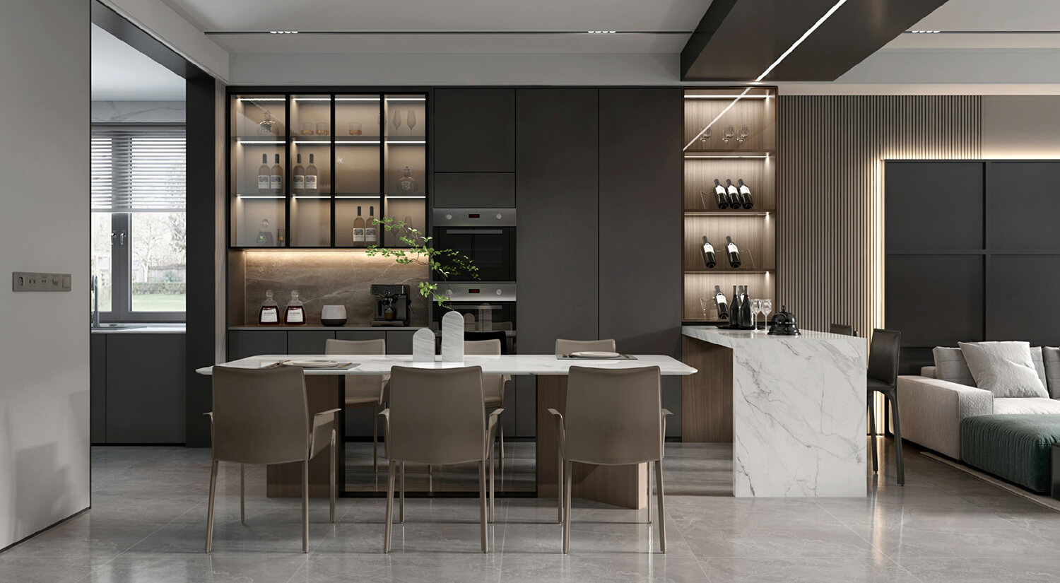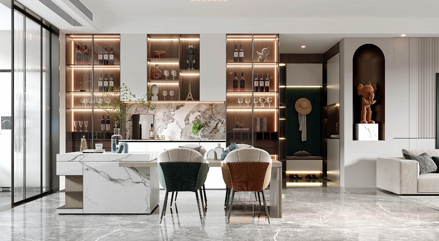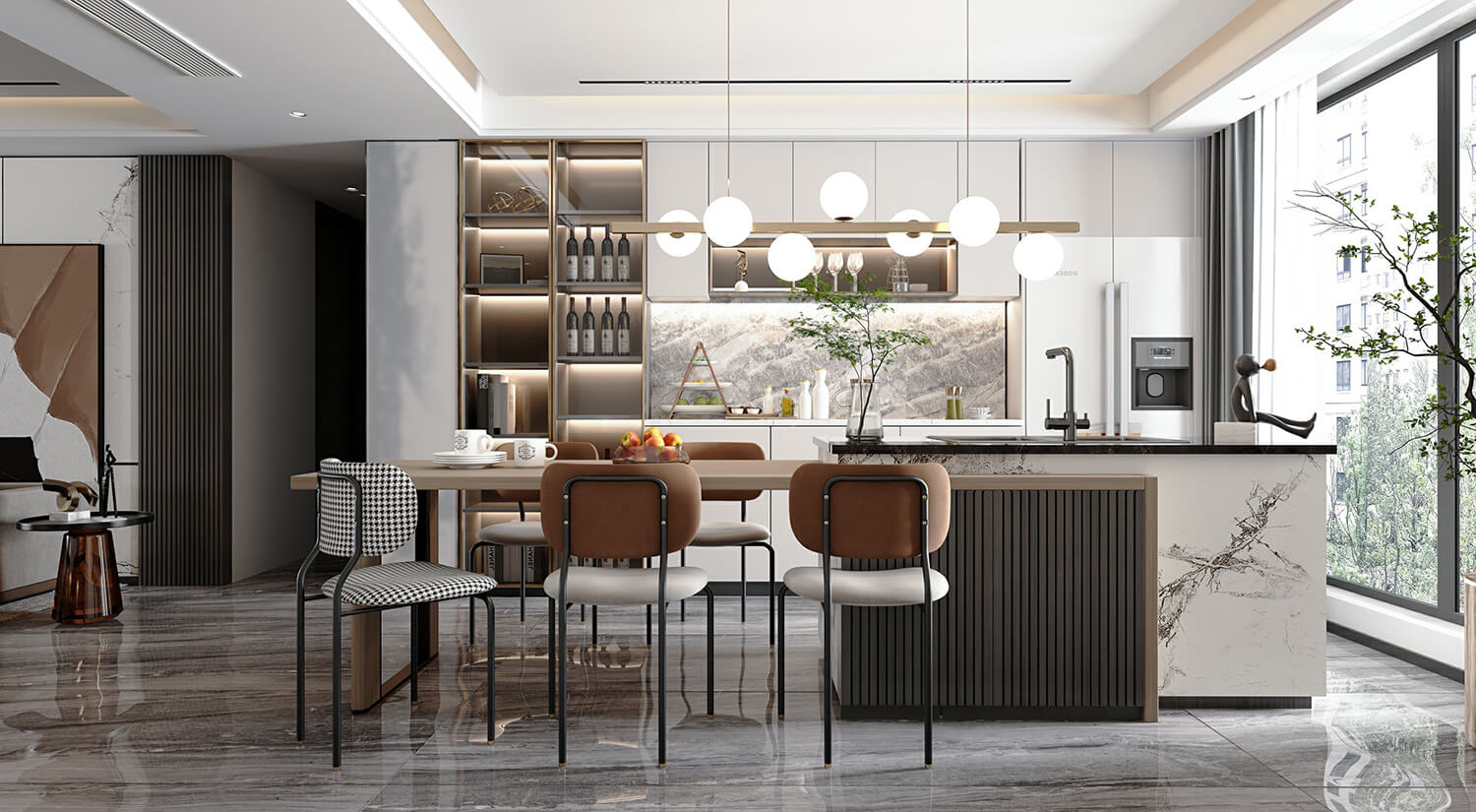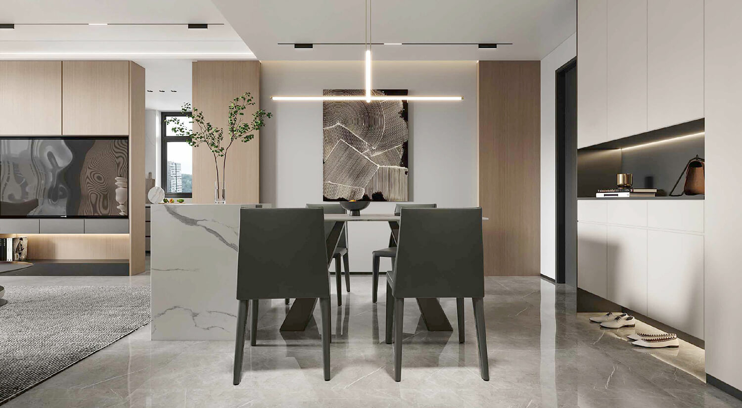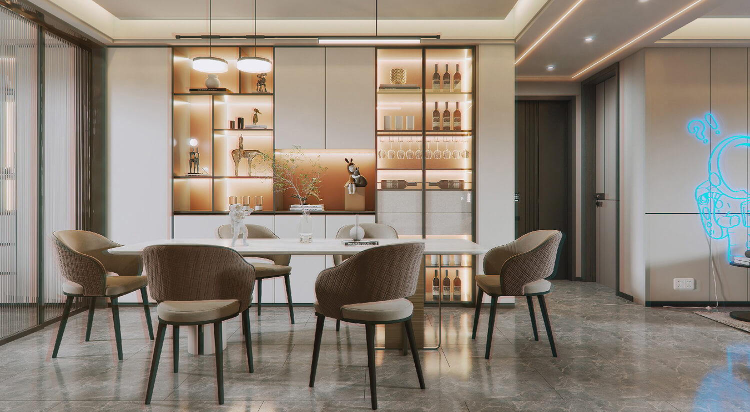 在現(xiàn)代輕奢風格的裝修中,還需要考慮空間布局和功能性的結合。一般會將客廳、餐廳打通,形成開放式的空間,增加通透性和流動感。暖色線燈烘托家的溫馨氛圍,享受與家人一起用餐的美好時光。