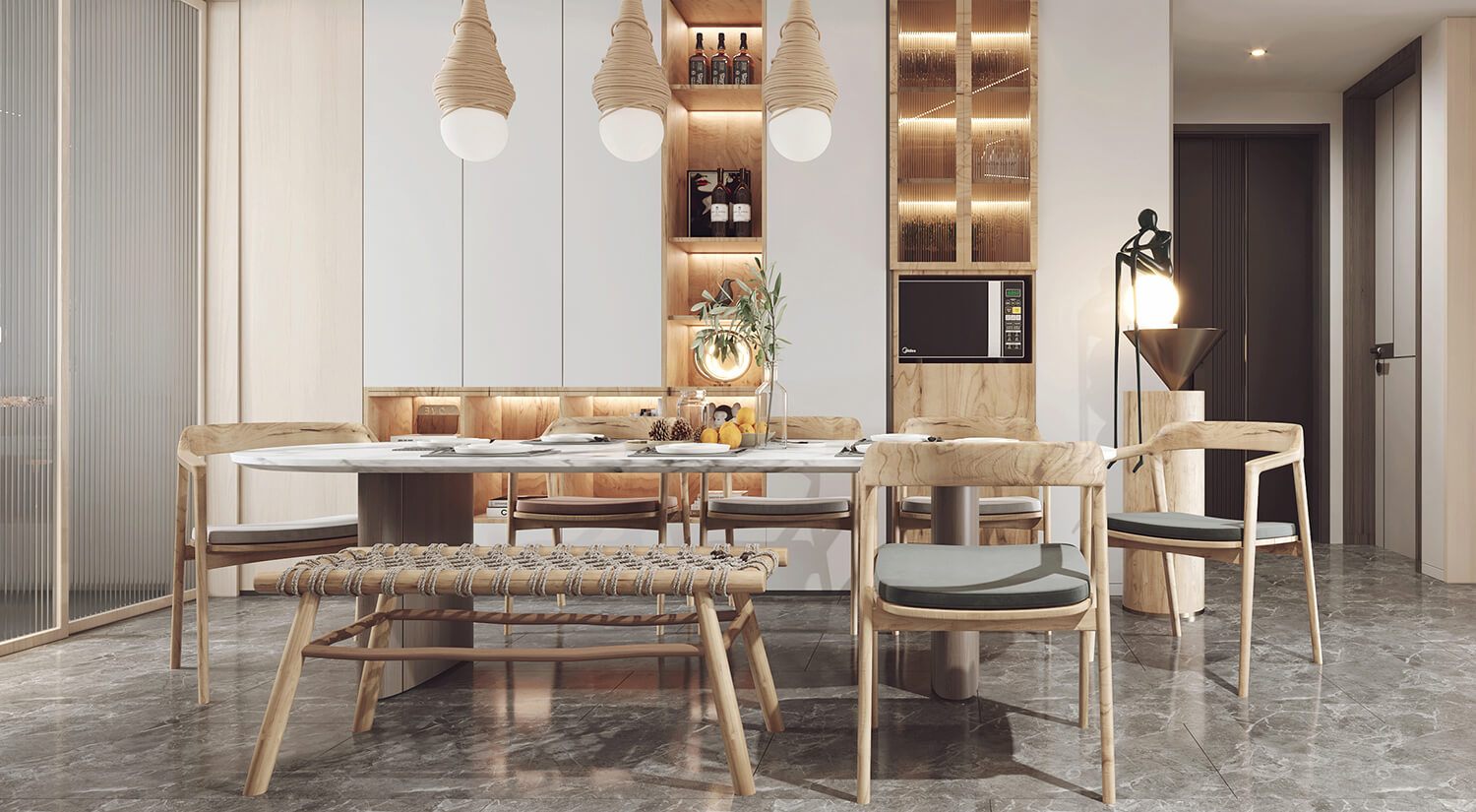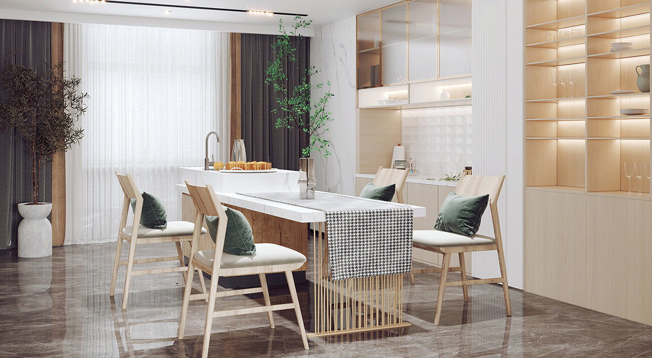 客餐廳使用了大量的木質材料做家具,房間呈現(xiàn)自然、溫暖和舒適的感覺。