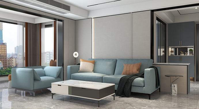 整個(gè)空間變得更加寬闊通透,視野也有一定的拓展,藍(lán)色系的空間在整個(gè)空間當(dāng)中變得更加大氣,再加上灰綠色的布藝沙發(fā),灰色的茶幾在色調(diào)上有的用的沖擊性豐富了整個(gè)空間當(dāng)中的層次。