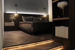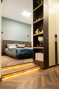 在臥室的臺階處制作地臺,加燈帶氛圍烘托氣氛,做柜子有效隔開衣帽間獨(dú)立空間。